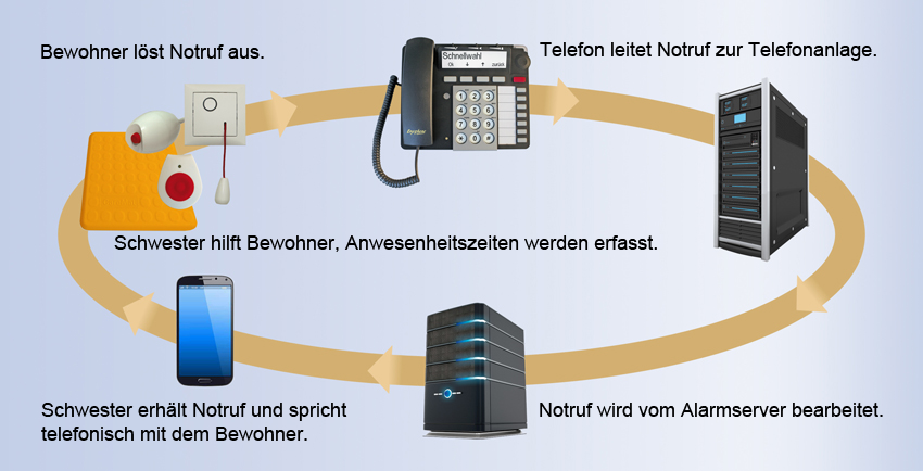 Die Nutzung bestehender Infrastruktur ist einer der großen Vorteile des Systems. Telefonsteckdosen und TK-Anlage sind in vielen Seniorenhäusern vorhanden. Der Alarmserver wird in das EDV-Netz integriert und übernimmt die Steuerung von Notrufen und Störungsmeldungen.